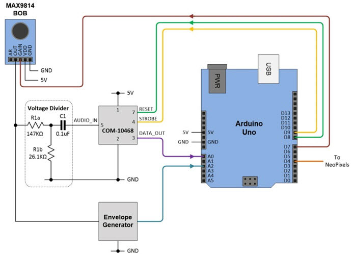 If all we wished to do was make all of the tubes light up with their brightness controlled by the amplitude of the audio signal, then we could simply connect the output from the microphone directly to one of the Arduino’s analog inputs.