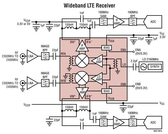 The LTC5592 is part of Analog Devices' family of dual-channel high dynamic range, high gain downconverting mixers covering the 600 MHz to 4.5 GHz RF frequency range. The LTC5592 is optimized for 1.6 GHz to 2.7 GHz RF applications. The LO frequency must fall within the 1.7 GHz to 2.5 GHz range for optimum performance. A typical application is a LTE or WiMAX receiver with a 2.3 GHz to 2.7 GHz RF input and low side LO.