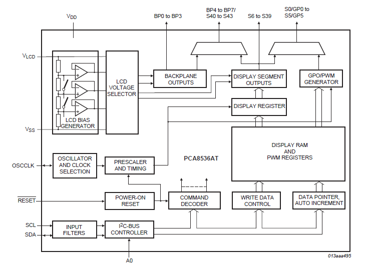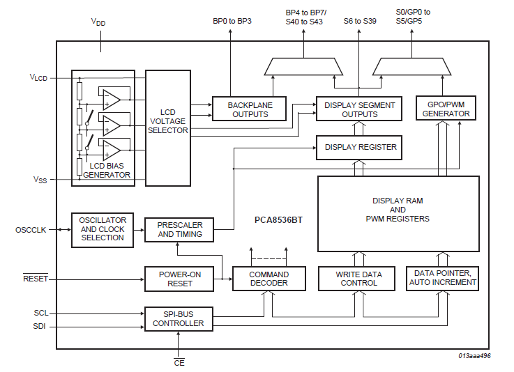 The PCF8536 (non-automotive grade) and PCA8536 (automotive grade) are peripheral devices which interfaces to almost any Liquid Crystal Display (LCD) with low multiplex rates. These drivers generate the drive signals for any multiplexed LCD containing up to eight backplanes, up to 44 segments, and up to 320 elements. These devices are compatible with most microcontrollers and communicates via the two-line bidirectional I²C-bus (PCx8536AT) or a three line unidirectional SPI-bus (PCx8536BT). Communication overheads are minimized using a display RAM with auto-incremented addressing.