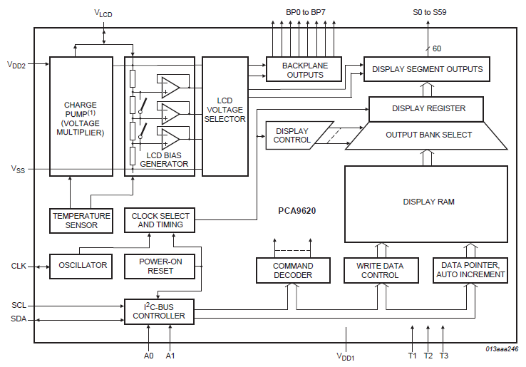 The PCA9620 is a peripheral device which interfaces to almost any Liquid Crystal Display (LCD) with low multiplex rates. It generates the drive signals for any static or multiplexed LCD containing up to eight backplanes, 60 segments, and up to 480 elements. The PCA9620 is compatible with most microprocessors or microcontrollers and communicates via a two-line bidirectional I²C-bus. Communication overheads are minimized using a display RAM with auto-incremented addressing and display memory switching. The PCA9620 features an internal charge pump with internal capacitors for on-chip generation of the LCD driving voltages.