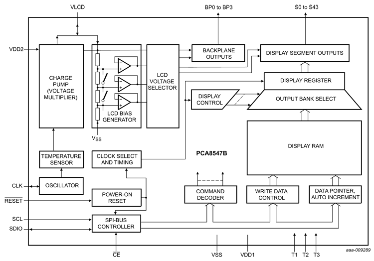 The PCA8547 is a fully featured AEC-Q100 compliant Liquid Crystal Display (LCD) driver, specifically designed for high-contrast Vertical Alignment (VA) LCD with multiplex rates up to 1:4. This driver generates the drive signals for any static or multiplexed LCD containing up to four backplanes, 44 segments, and up to 176 elements. This device features an internal charge pump with internal capacitors for on-chip generation of the LCD driving voltage. To ensure an optimal and stable contrast over the full temperature range, this device offers a programmable temperature compensation of the LCD supply voltage. The PCA8547 can be easily connected to a microcontroller by either the two-line I²C-bus (PCA8547AH) or a three-line bidirectional SPI-bus (PCA8547BH).